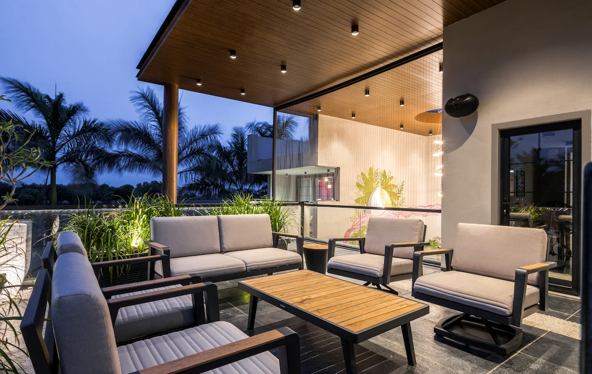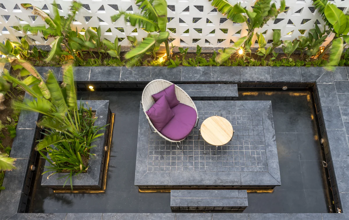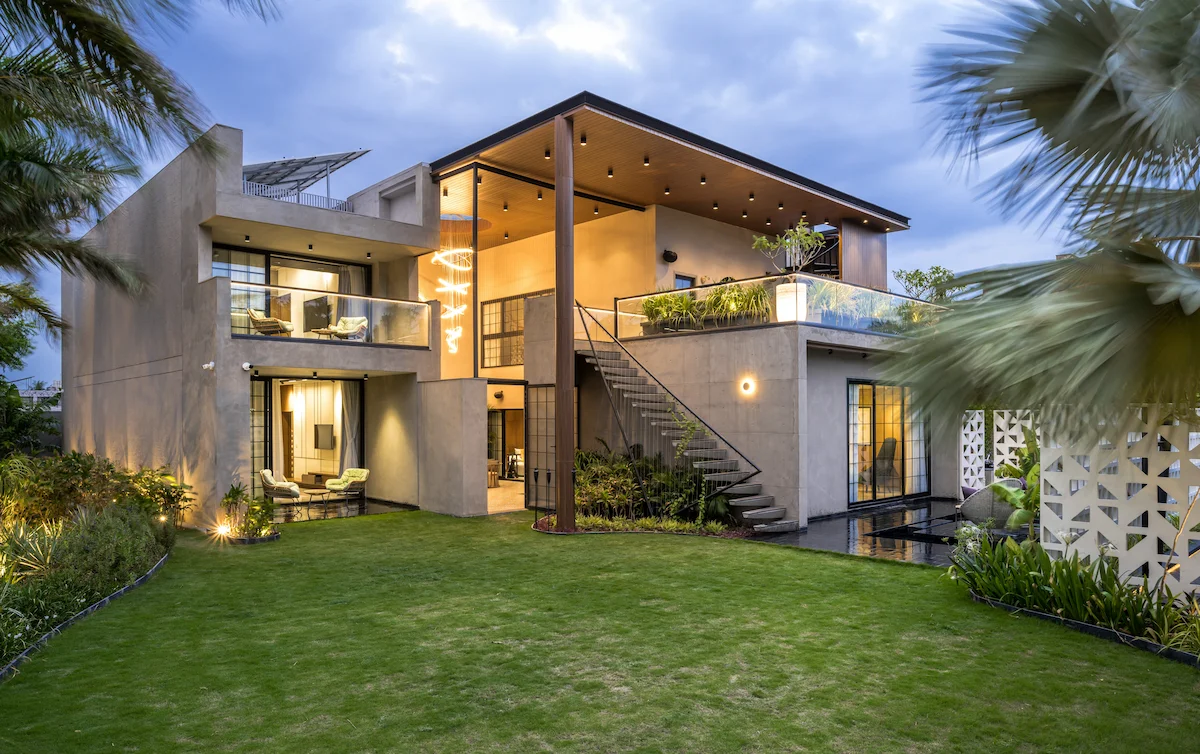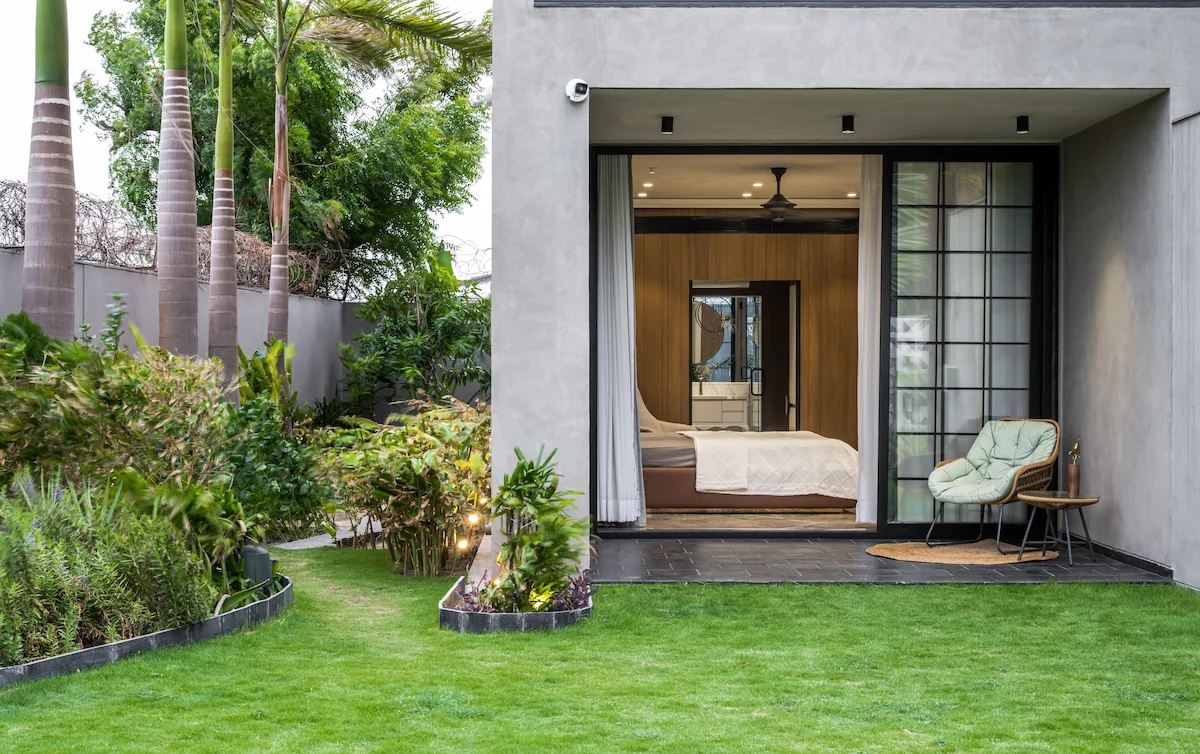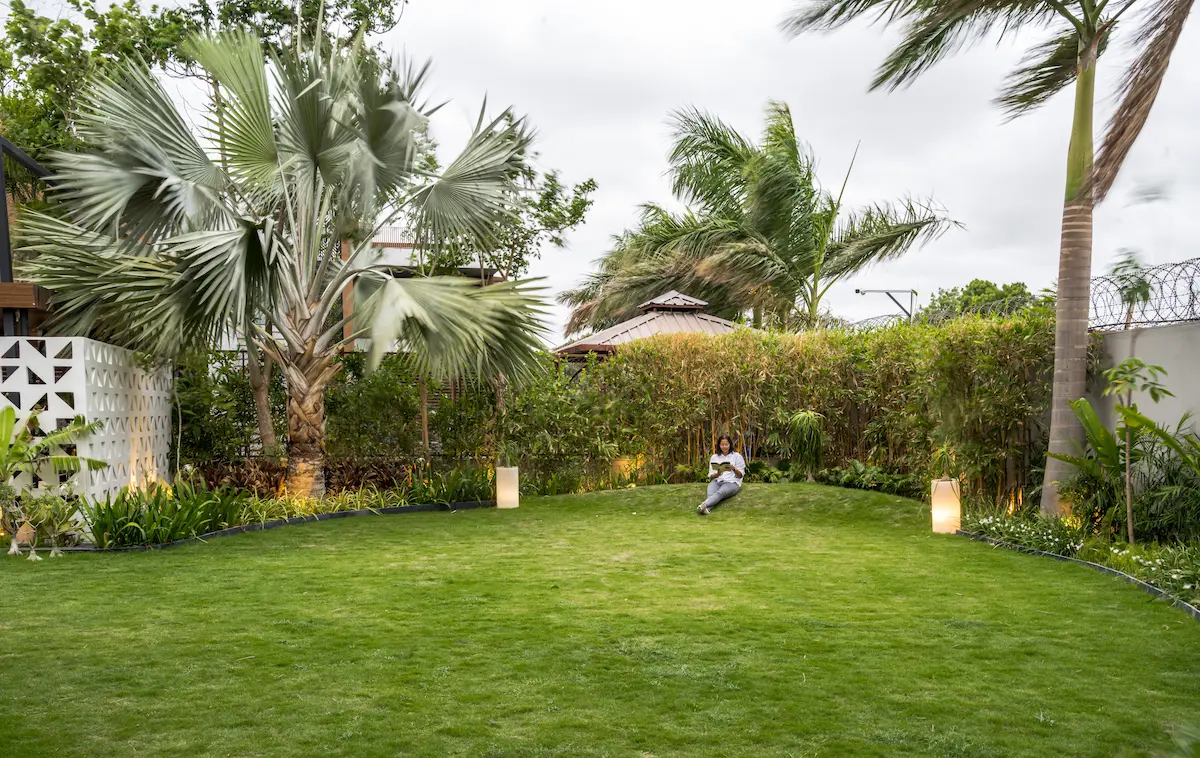 The design seamlessly connects indoor and outdoor spaces, with a water feature and tropical plants extending the living area. The parents' bedroom opens to the lawn, offering a view of their grandchildren playing. The backyard garden formality with productivity.