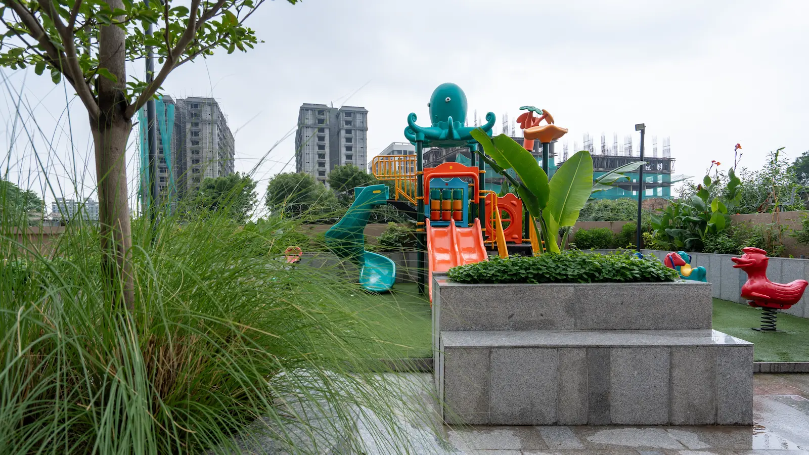 The central idea was to introduce a single defining element that gently anchors the space. This feature seamlessly merges with the surrounding greenery, allowing it to feel natural and integrated within the landscape, while still standing out as a subtle highlight. Carefully placed planting softens the edges and creates pockets for gathering, play, and quiet pause.