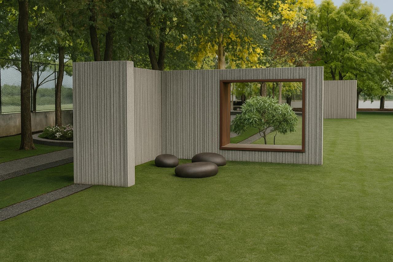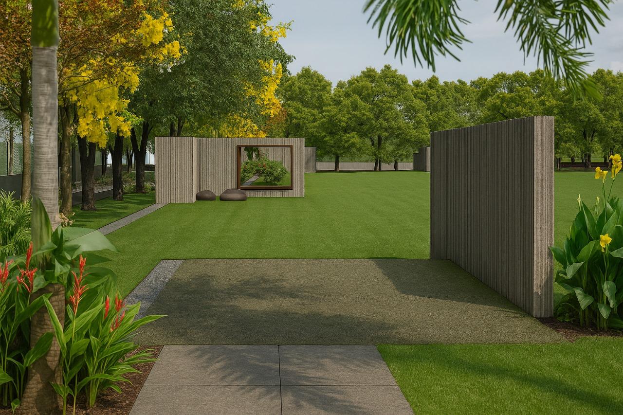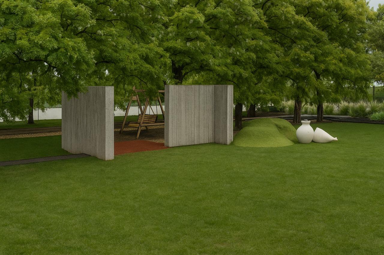 Designed as a personal retreat for an architect, this second home landscape becomes an exploration of space, proportion, and pause. The site is organized around a central lawn — a calm, open datum that anchors the composition and allows the built form to breathe. Around it, pathways of varied textures trace the edges of the plot, guiding movement through a carefully choreographed sequence of experiences. Freestanding walls act as spatial frames, capturing views, filtering light, and creating moments of anticipation.