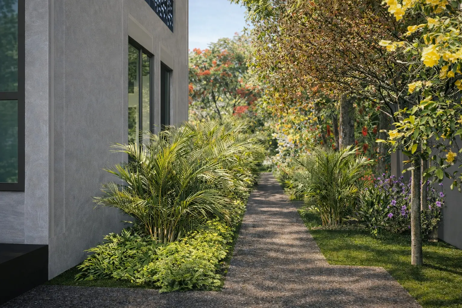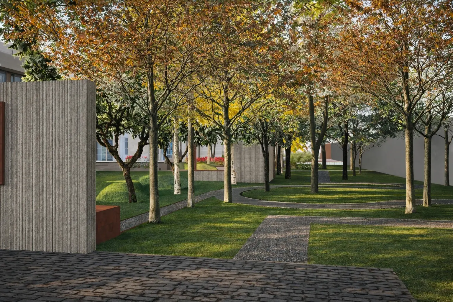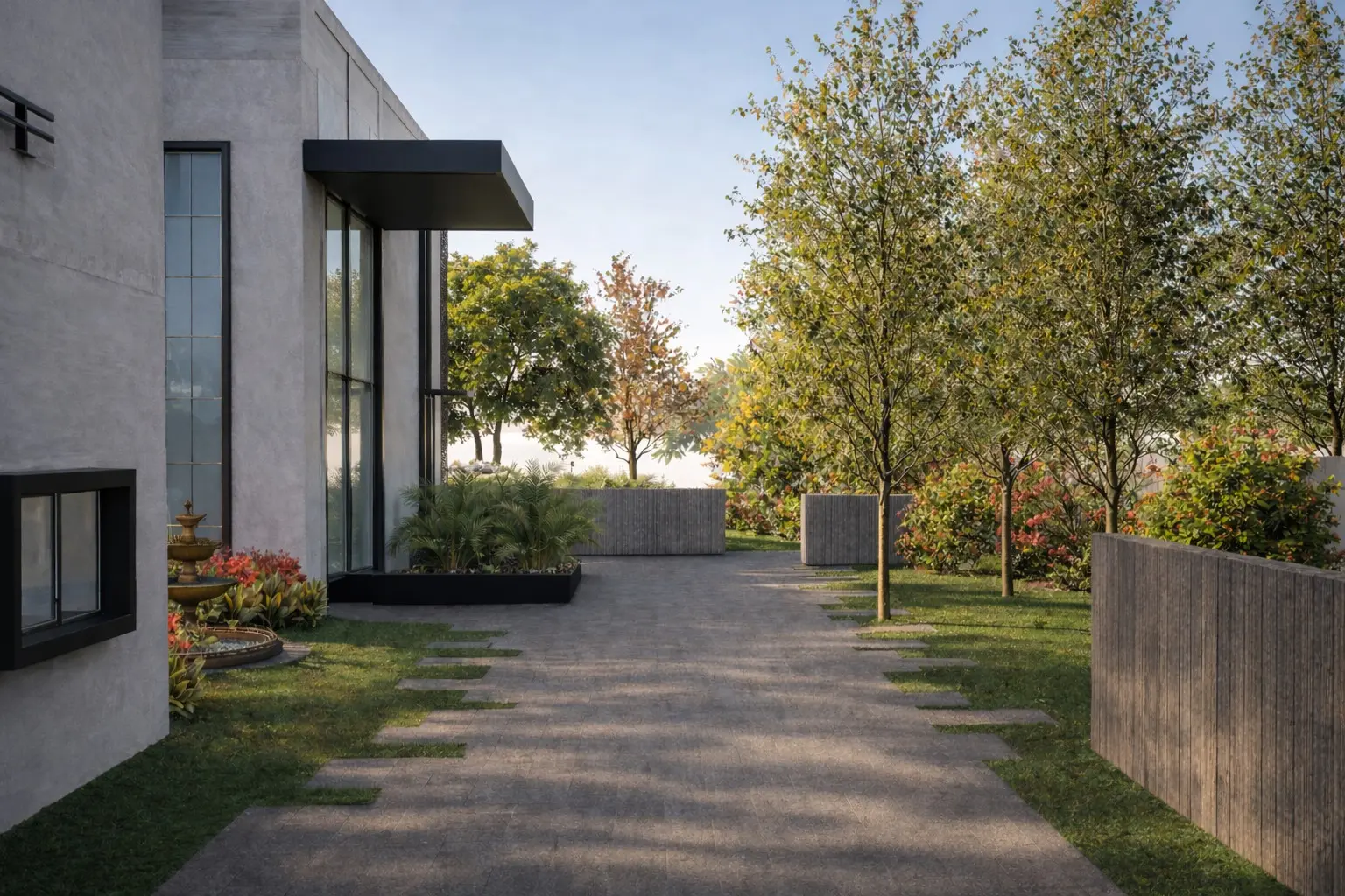 Designed as a personal retreat for an architect, this second home landscape becomes an exploration of space, proportion, and pause. The site is organized around a central lawn — a calm, open datum that anchors the composition and allows the built form to breathe. Around it, pathways of varied textures trace the edges of the plot, guiding movement through a carefully choreographed sequence of experiences. Freestanding walls act as spatial frames, capturing views, filtering light, and creating moments of anticipation.