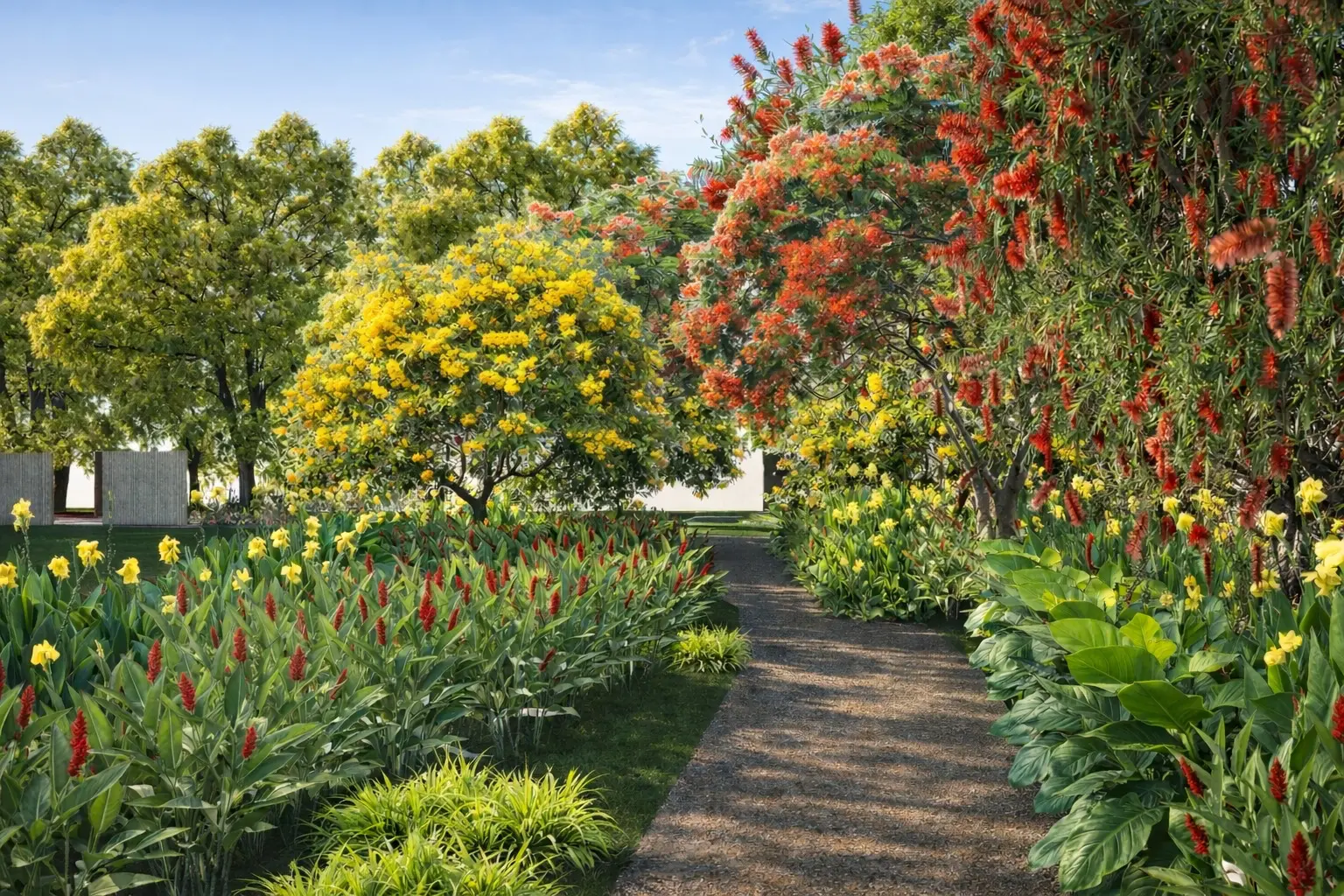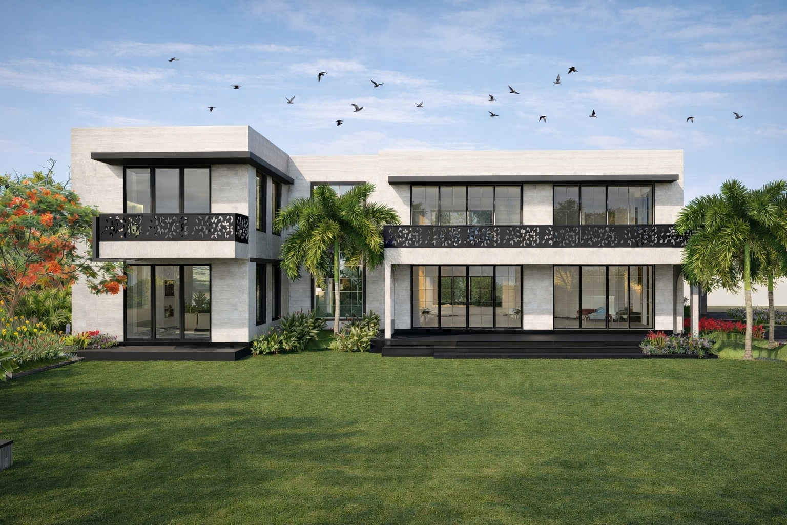 The landscape for the house is designed by making linear walls, that frame the landscape elements and a pathway meandering or linear, that encapsulates the whole.