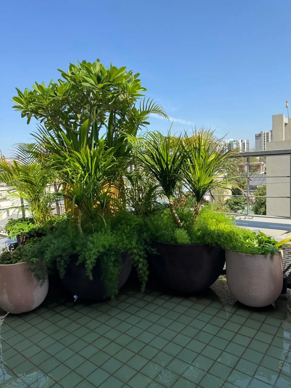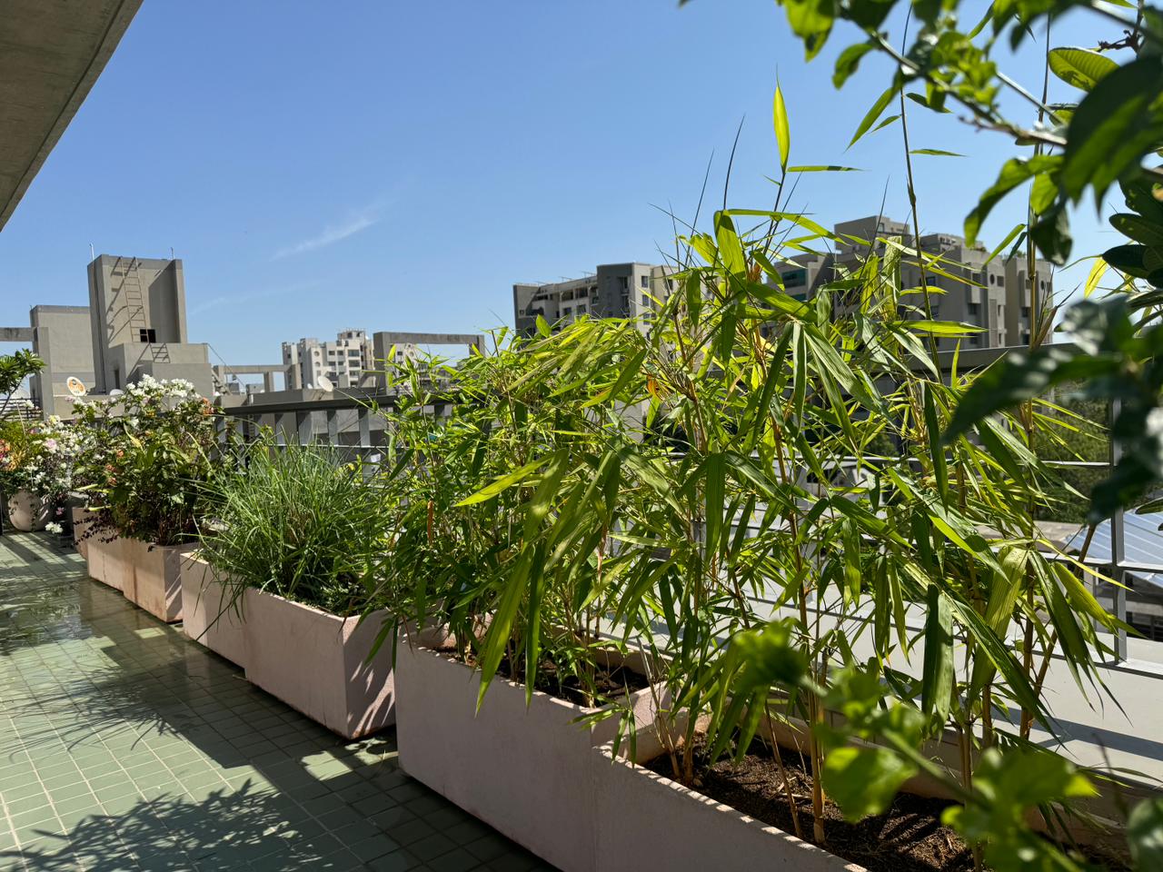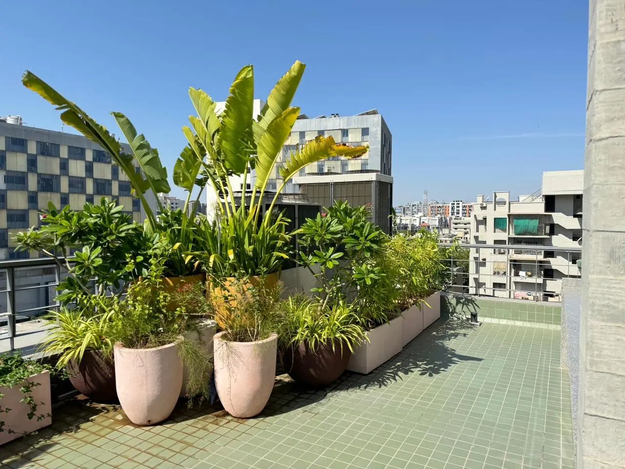 This rooftop terrace landscape provides a peaceful retreat. A collection of thoughtfully arranged pots forms a vibrant display of colors and textures. The plants are chosen for their ability to flourish in the rooftop setting. Planters featuring ornamental plants and small trees add vertical dimension, enhancing depth and creating a sense of enclosure. The space becomes a cozy seating area, enveloped by greenery, ideal for enjoying a morning tea or hosting evening gatherings with family and friends.