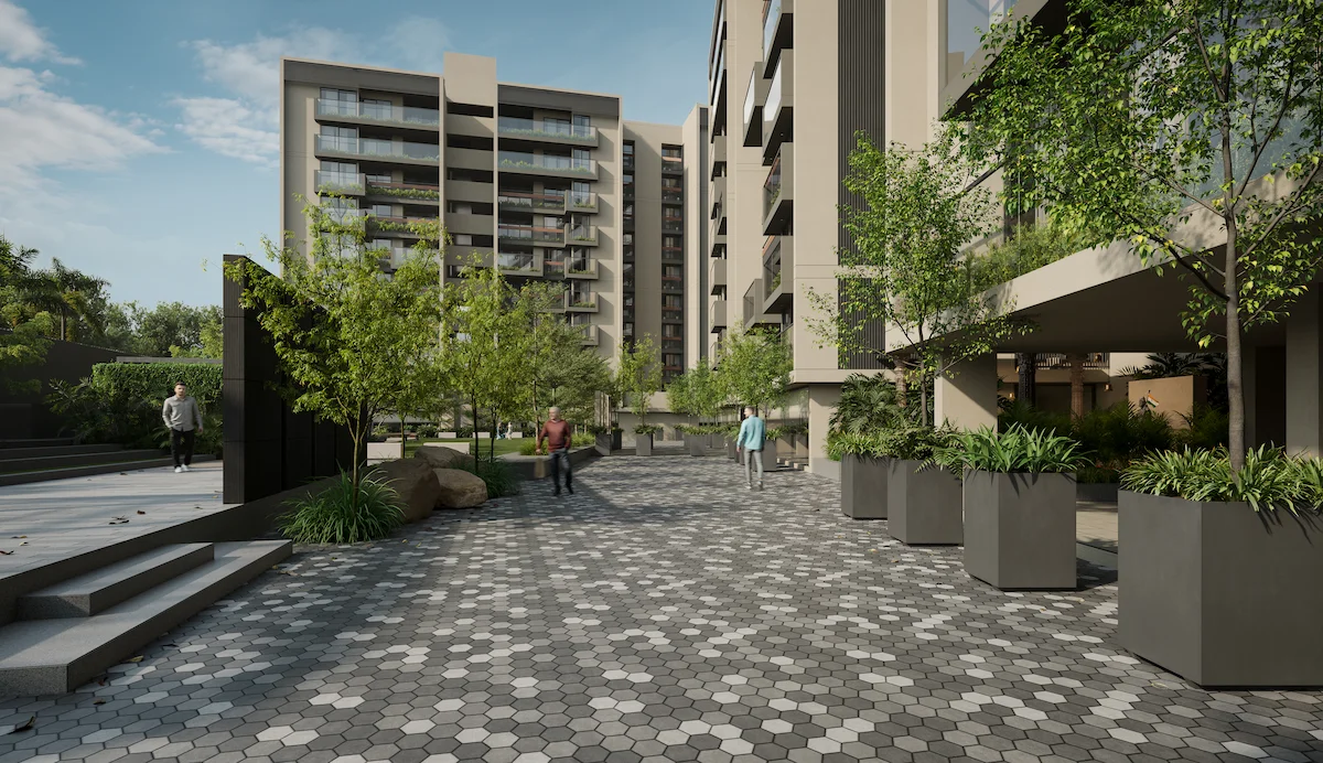 A curated flooring palette defines each community space while maintaining a cohesive landscape language. Textures and materials shift to suit activities—crazy patterns for play areas, calm stone for senior seating, durable surfaces for game courts, and expressive paving for cultural gatherings. Around the pool is rhythmic, cooler and relaxed textures to enhance comfort and visual diversity.