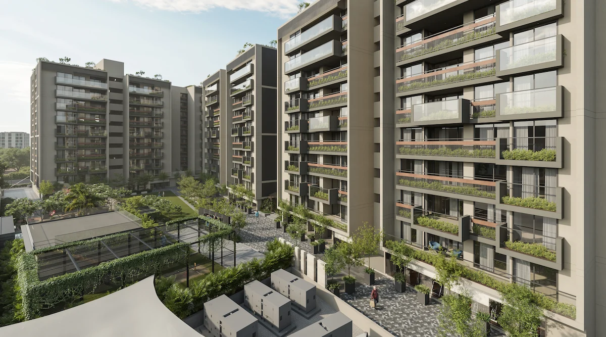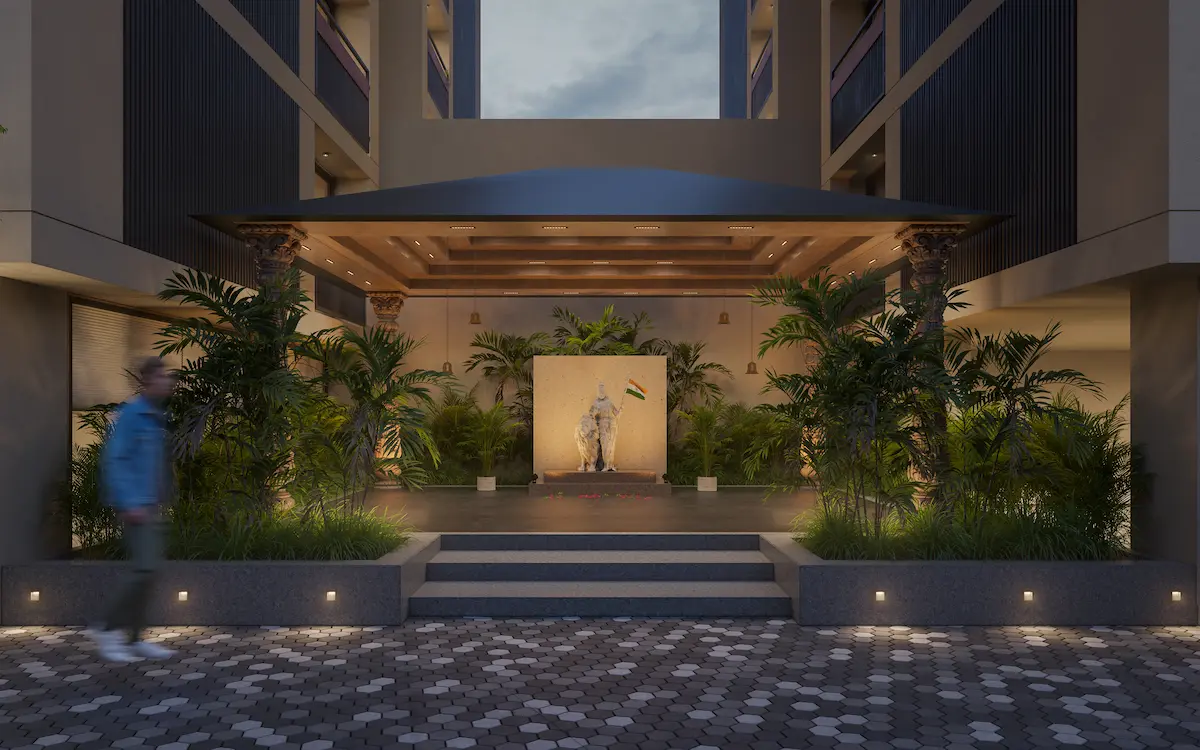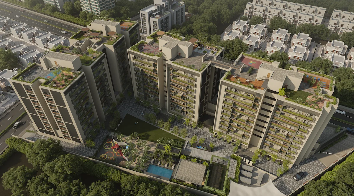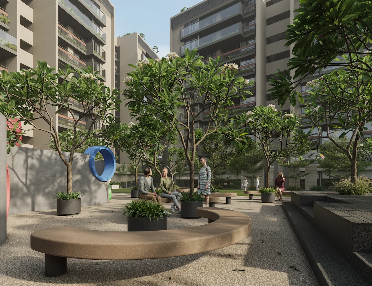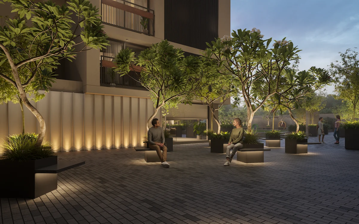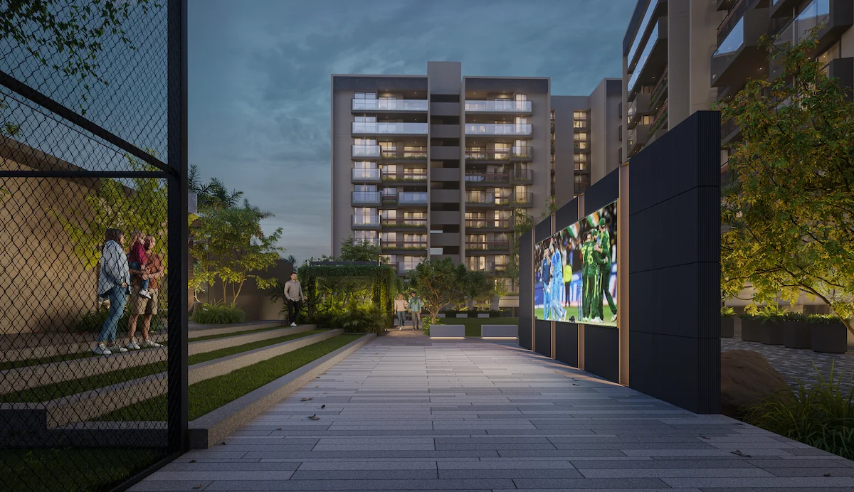 The community engagement space is designed to cater all age groups, fostering a sense of belonging through diverse amenities and activities. The landscape is thoughtfully organized with multifunctional zones including play zone, Senior citizen space, Swimming pool, Yoga area, Area for Cultural programs, Outdoor screening, Game court etc.