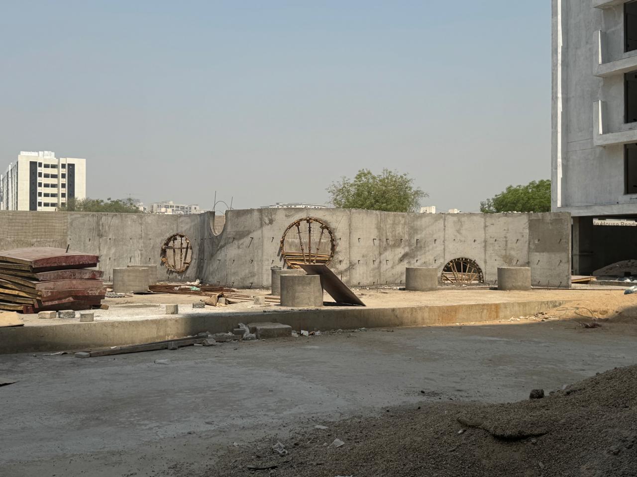 A playful wall with circular punctures encourages interaction in the children’s zone, while pergola structures create shaded gathering spaces. Movable planters introduce flexibility and greenery, and textured stone cladding defines edges and backdrops—together forming a cohesive yet dynamic setting for recreation, rest, and community life.