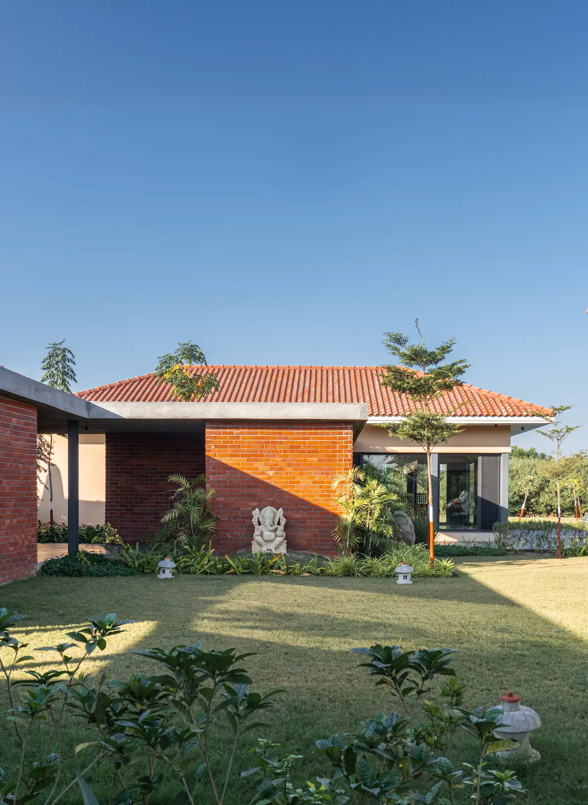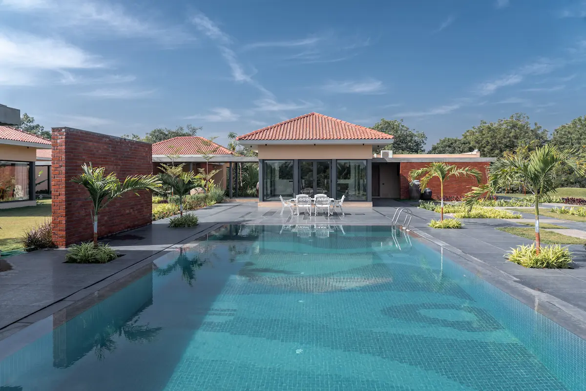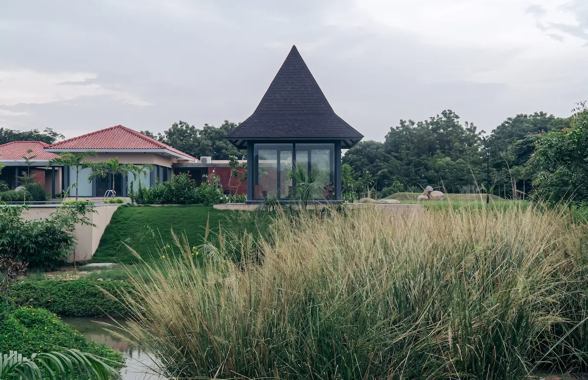 The farmhouse is not just a home, but a living example of sustainability, seamlessly integrating modern living with the surrounding natural environment. Situated on the outskirts of Ahmedabad, surrounded by idyllic agricultural fields, open plots, and a charming canal fringe, our design vision is inspired by the beauty of this natural canvas. The design is divided into distinct zones that serve various purposes, including orchards, Productive Garden, ponds, meadows, flower gardens, woodlands, and courtyards. These elements work together to create a harmonious space where relaxation, self-sufficiency, and recreation are prioritized. Every detail of the design is carefully considered to promote a deep connection with nature, fostering a sense of immersion where the boundaries between indoor and outdoor living become blurred.