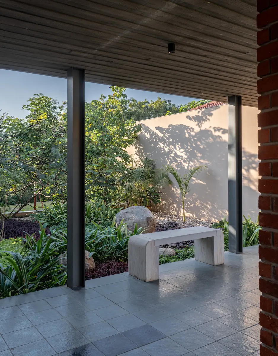 The design process integrates architecture with the landscape, shaping the built form along natural contours to create courtyards and in-between spaces that blur the line between indoors and outdoors. A central open space anchors the layout, unifying interior areas with the landscape through passages that connect all spaces. Water-sensitive design directs runoff into a central water body and recharge well, promoting sustainability. Native and fruit-bearing trees enhance biodiversity, while passage walls act as highlight elements, guiding movement and framing views within this seamless connection of architecture and nature.